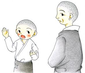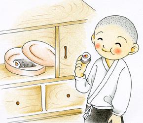 山寺の和尚と、小僧がおった。和尚が内証で、すしをこしらえて戸棚にかくしておき、 「この戸棚をあけてはならんぞ」 といっておいて、外へ出た。 あとで、小僧がソーツと戸棚をあけてみると、すしがあった。これじゃな、と思うて、一つ取って食うた。あまりうまいので、また一つ食い、また一つ食いするうちに、みんなないようになってしもうた。小僧は考えて、本堂の阿弥陀さんの口のはたに飯粒を少しなすりつけておいて、知らん顔をしていた。 |