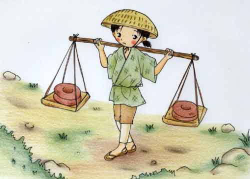 金持の娘は、その婿さんが、あんまり、やだな男だから、もう帰ってきてくれないようにと思うて、弁当の握り飯(にぎりめし)の中へ、そっと毒を入れて、持たしてやった。炮烙売の武士は、そんなことは何も知らないで出ていった。