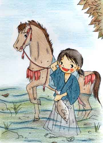 その評判は、とうとう、お殿様の耳に入った。そがいにえらい者なら、家来(けらい)に抱えたいというて、五、六人の侍を炮烙売の家来につけて、馬で迎えによこされた。炮烙売は、これは困ったことになってきたと思うたけれども、仕方なしに出て行くことにした。供(とも)の侍たちは皆、達者(たっしゃ)の馬に乗る。炮烙売は、まだ一度も馬などに乗ったことがないので、一番尻から遅れて歩いていった。