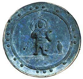 | 懸仏は社寺の堂内に懸けるものですが、この八幡宮神社の懸仏は、本殿内にの神体の一部として木造鏡台に載せて奉安されています。懸仏の形は通例の造りで、面径18.9cmの小型の円形木版に薄い銅板をおおい、二重の覆輪を打って外区と内区に分けています。細帯状の外区には珠文を打ち並べ、内区には中央に火炎光背を負う毘沙門天王立像、その足下に波形、像の左右に華瓶を貼りつけています。残念ながら、華瓶1個、珠文、吊輪金具などが失われています。尊形に毘沙門天王を表している点が特徴で、室町時代の作と判定され、相生市では中世の懸仏は本品だけで、貴重なものとなっています。 |